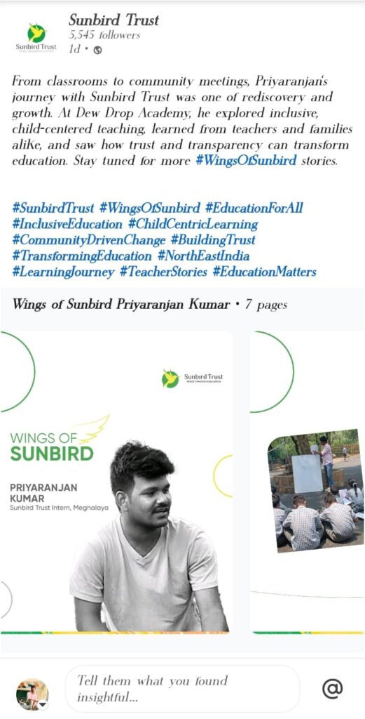 Priyaranjan Kumar’s field immersion with Sunbird Trust at Dew Drop Academy transformed theory into practice. Working with local teachers and mentor Mirudhulla Ma’am, they supported child-centred, inquiry-based lessons and community projects that made learning relevant to rural life. Sunbird Trust’s infrastructure upgrades—classrooms, water, electricity and transport—combined with teacher training powered enrollment from a few dozen to over 240 students. Dew Drop now models inclusive education: low fees, scholarships for vulnerable children, contextual curriculum and active learning. This success demonstrates how sustained mentorship, community ownership, and respectful pedagogy can create resilient schools that truly open opportunities for every child and beyond.